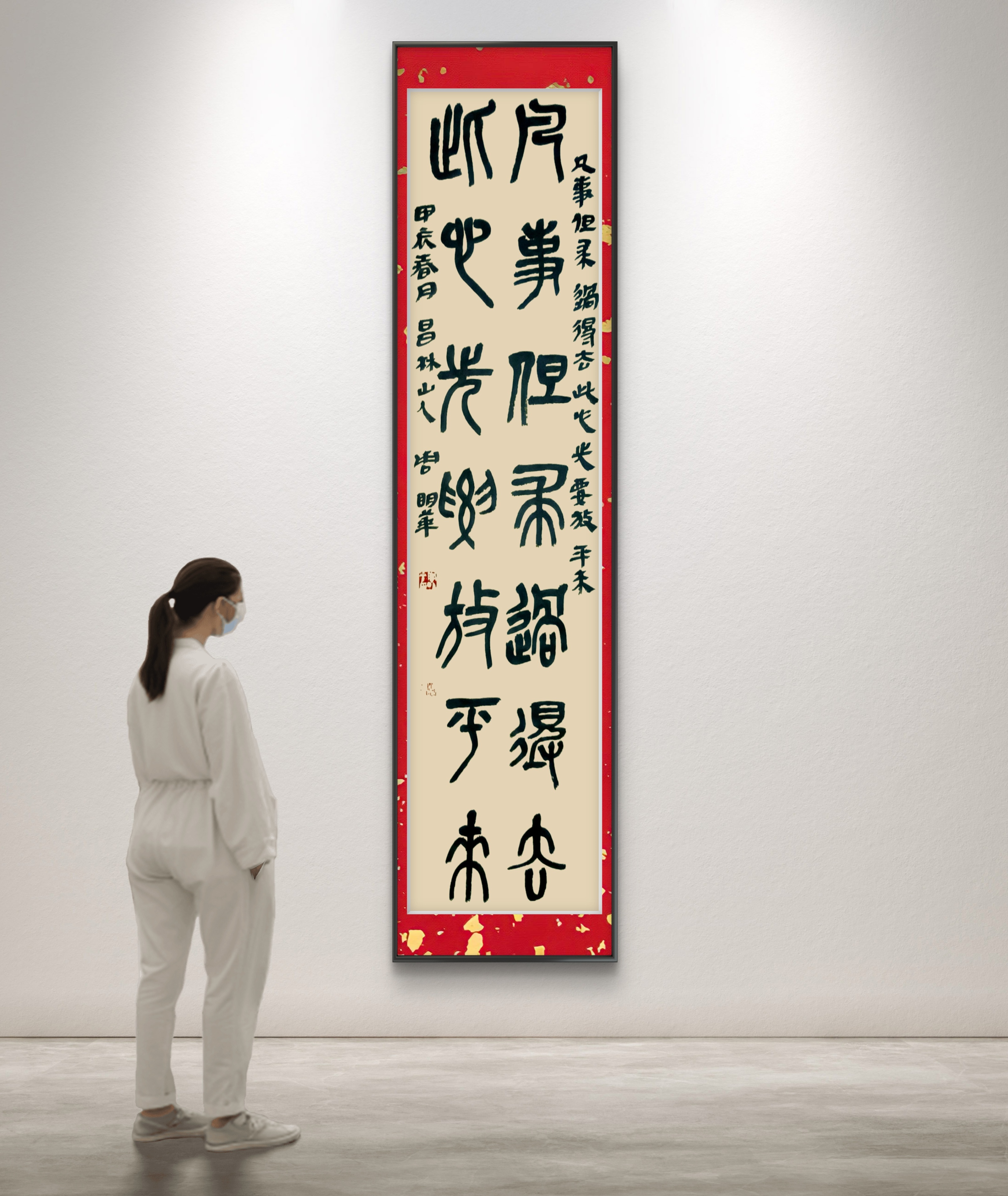 丁嘉耕书乔迁新居对联 华堂翠幔春风至 绮客金屏曙色开