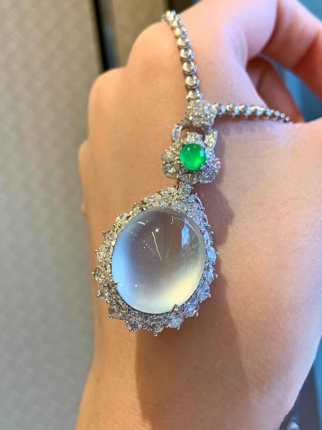 项链的主体由冰种飘花翡翠组成,质地晶莹剔透,飘花的图案如同一幅抽象