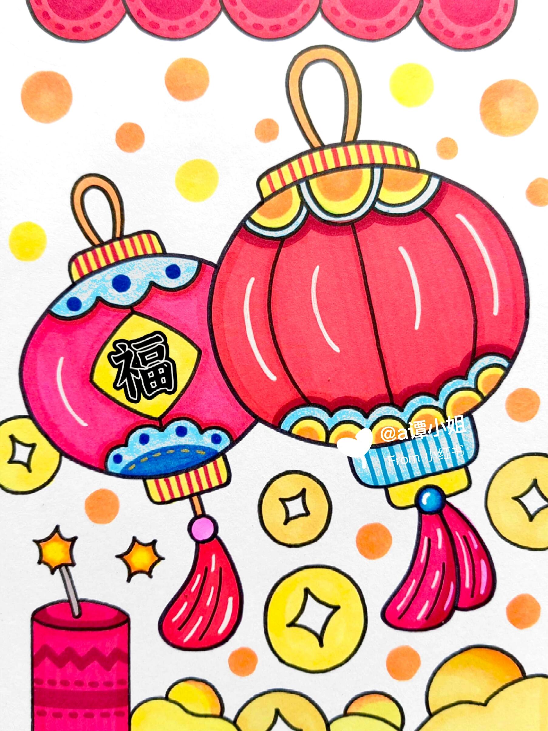 大红灯笼高高挂,简单的新年主题画,收藏起来吧!#