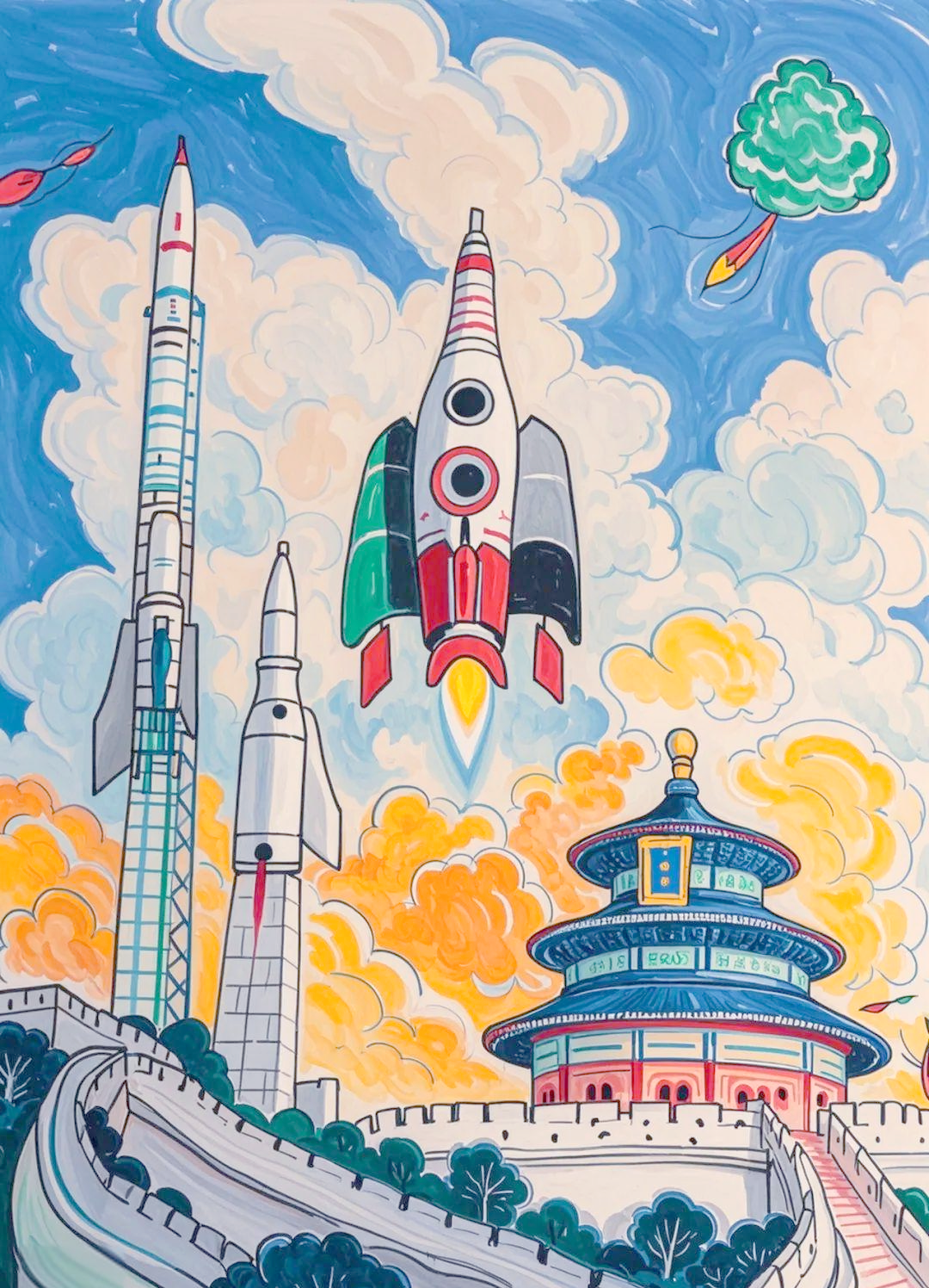 创意儿童绘画构思,红色主题,展现对祖国的热爱与未来憧憬