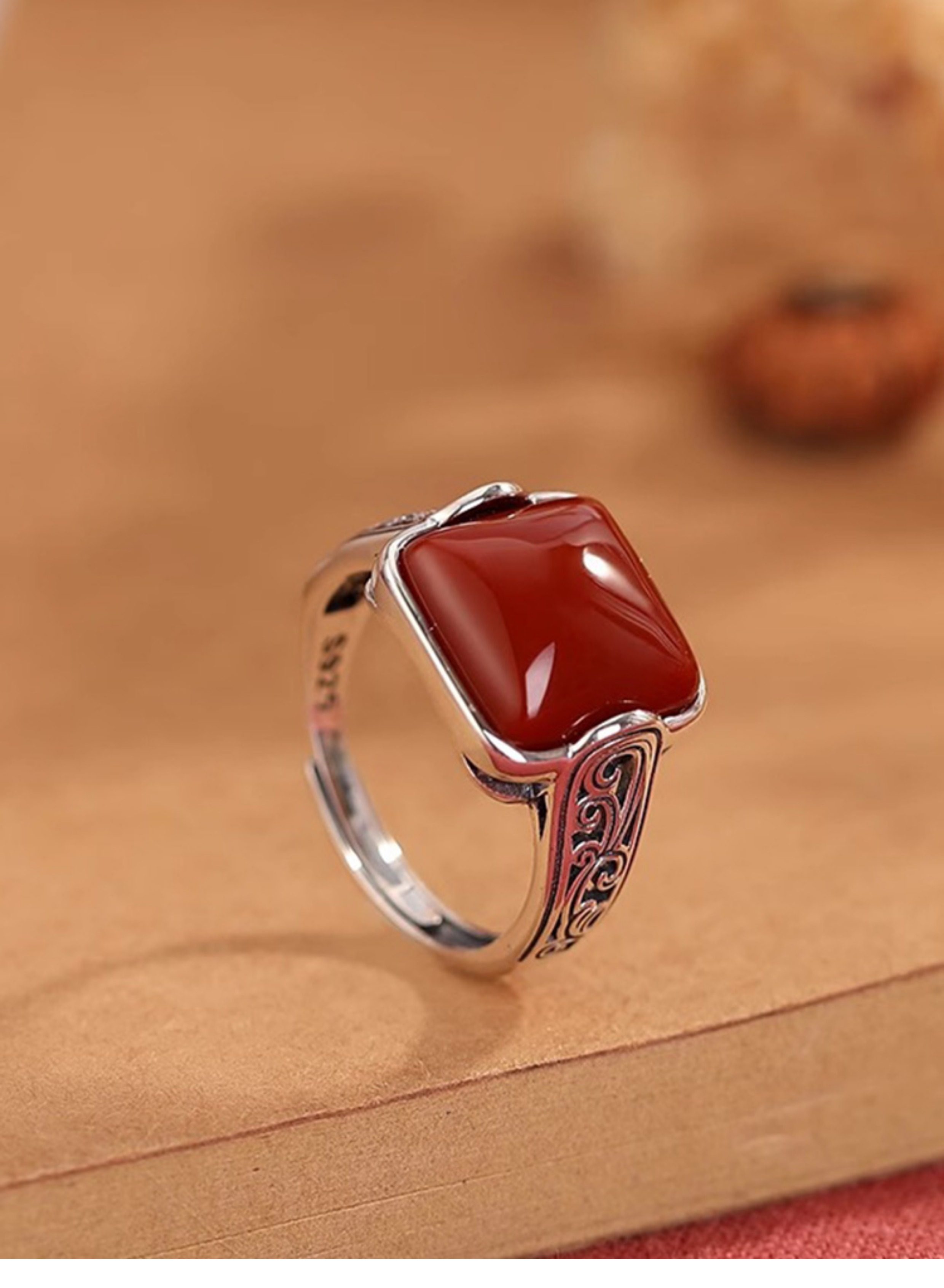 天然南红玛瑙首饰女古法红色宝石妈妈纯银中式方糖戒指轻奢高级感