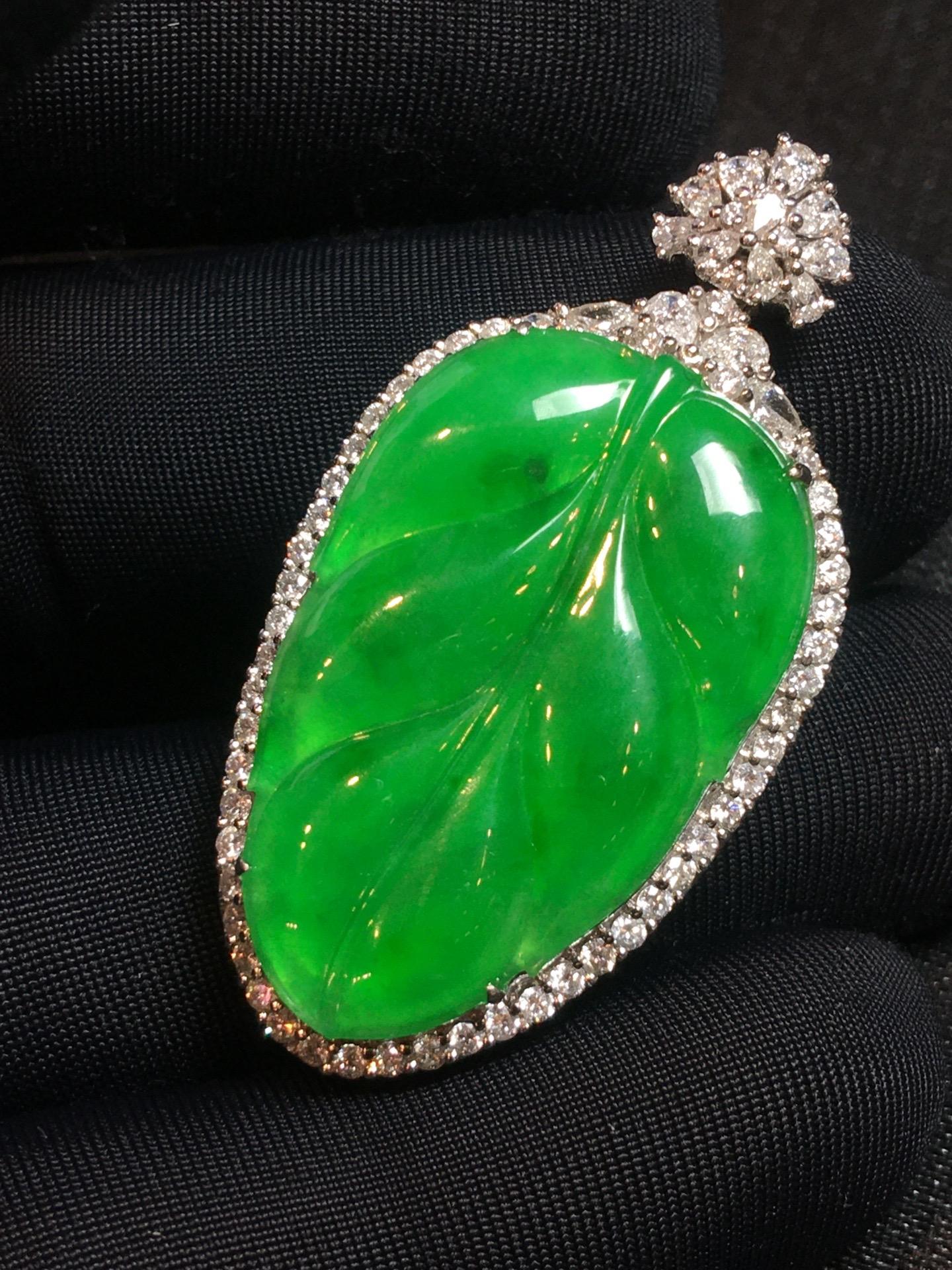 老坑冰糯种飘花玉叶翡翠挂件, 玉质细腻,水亮光润,质地细滑拍品详情2