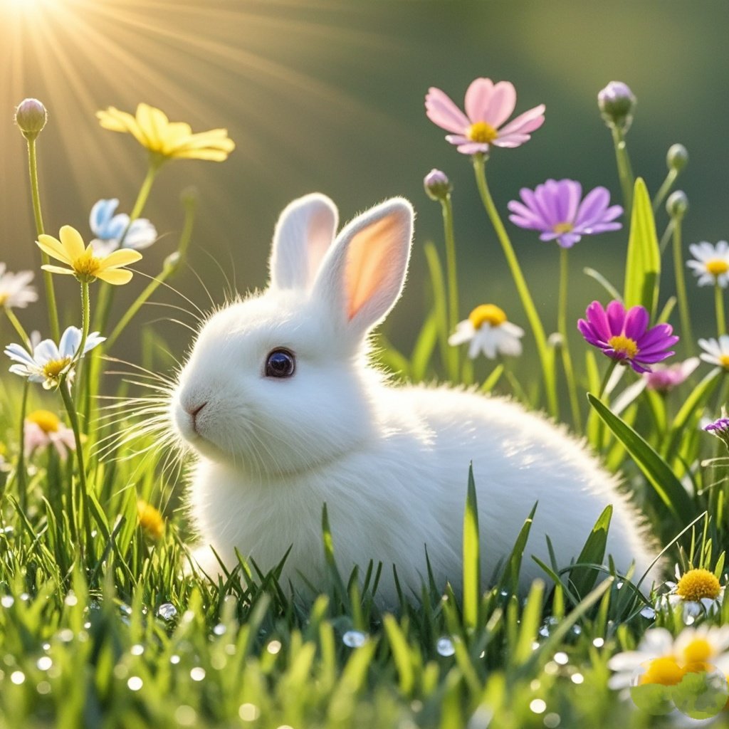 在绿意盎然的草坪上,一只小白兔悠闲地散步,头顶上还顶着一朵小黄花