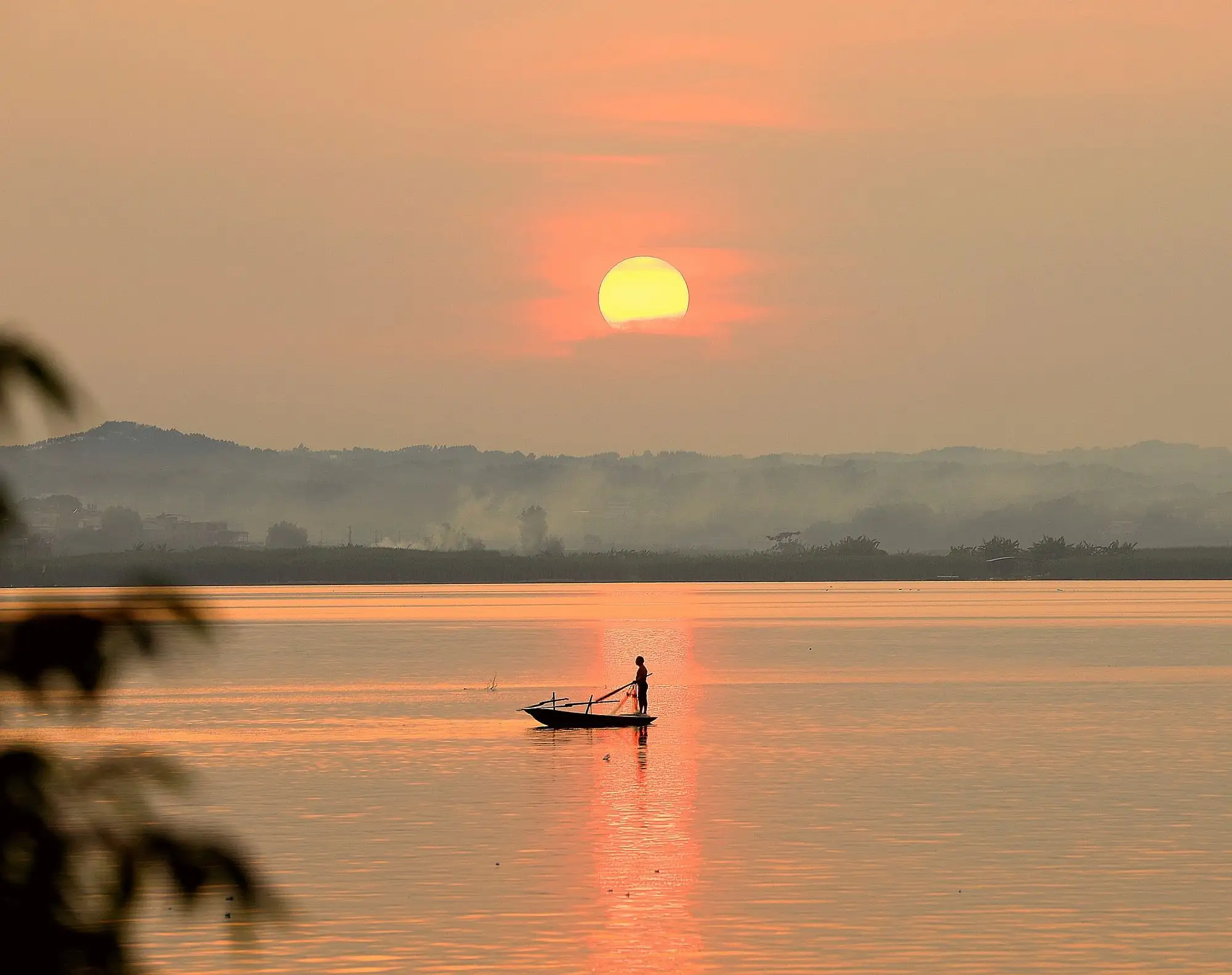 落日余晖中,我独自坐在湖边,感受着宁静与温暖