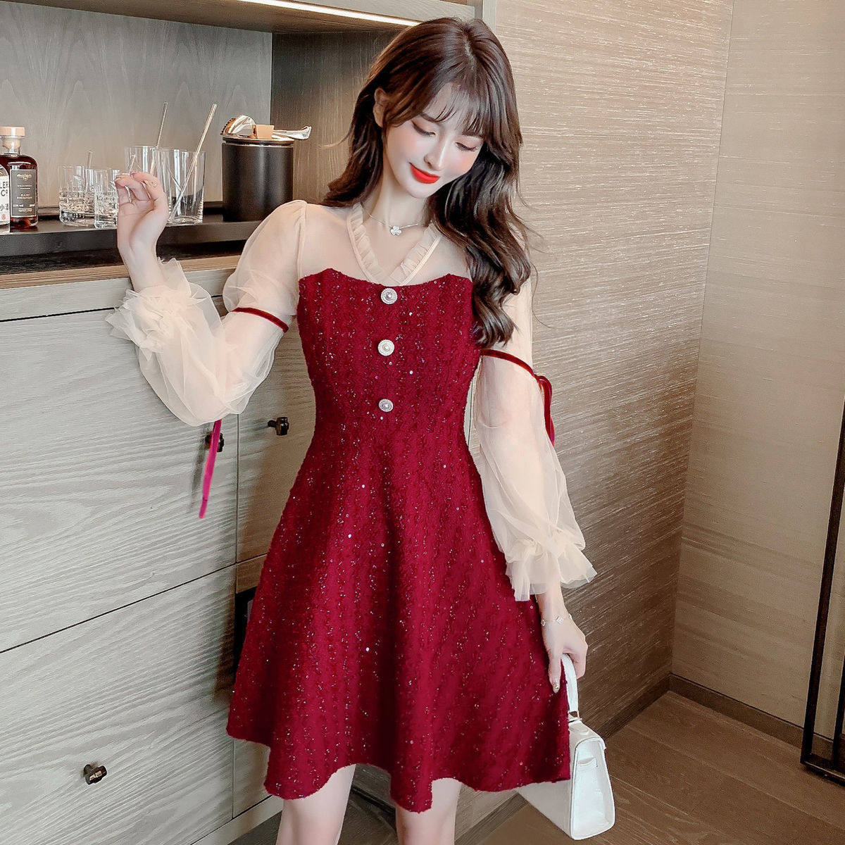 cfkl红色连衣裙女法式年新款秋冬女装网纱拼接小个子过年喜庆裙子红色