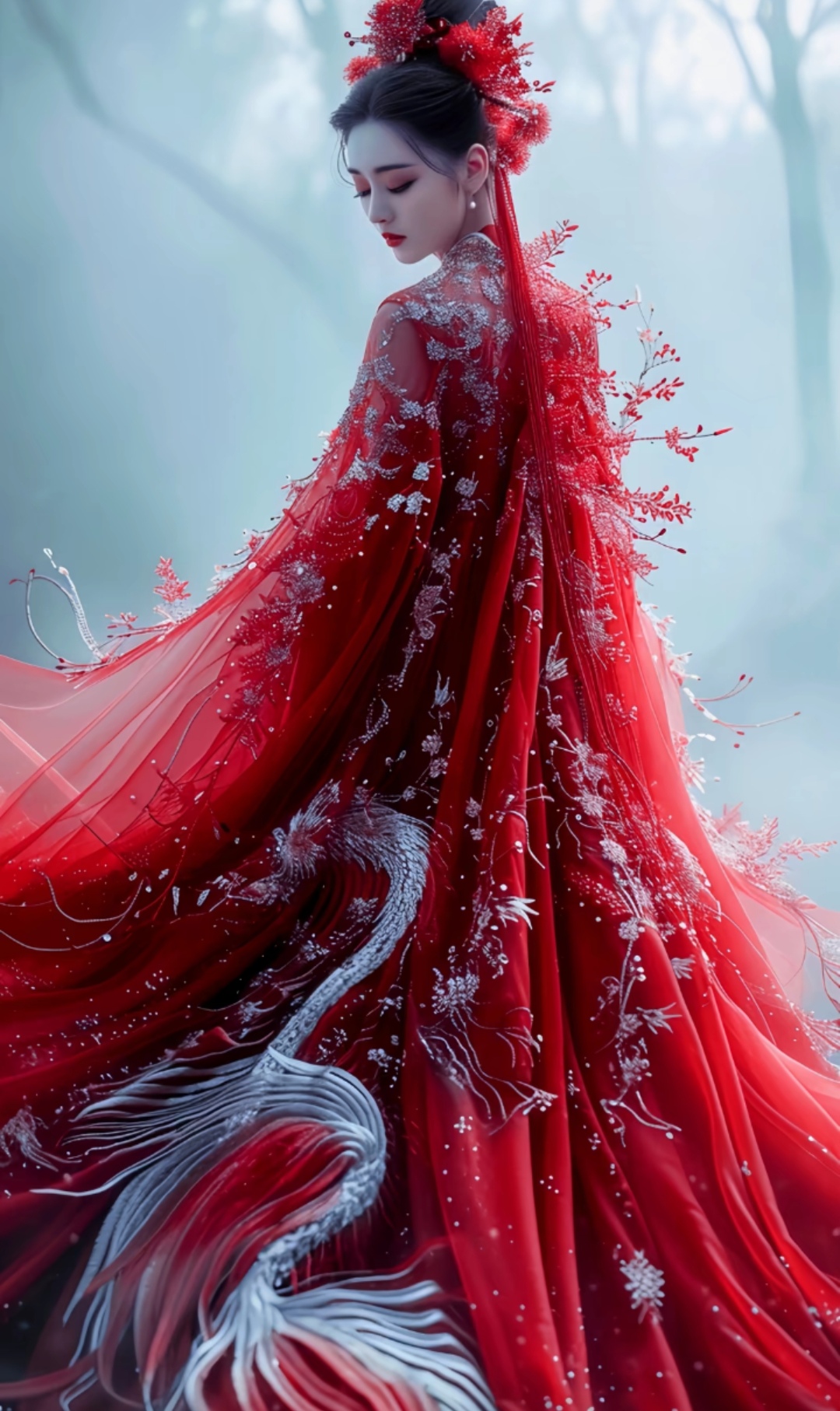 女子绰约而立,一袭红裙似燃烧的火焰,轻盈薄纱随风舞动,勾勒出曼妙