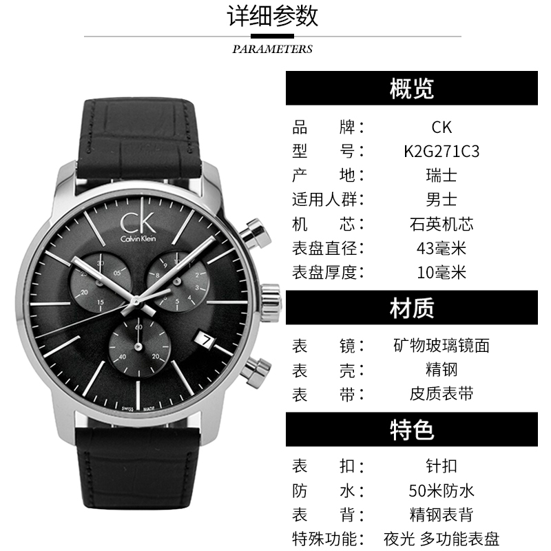 卡文克莱calvinkleinck手表男表皮带大方石英表k7621192男表黑色